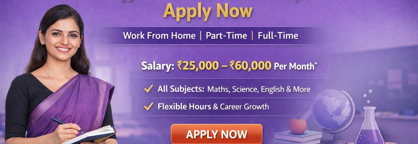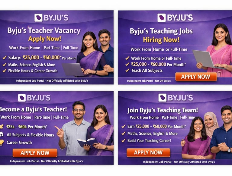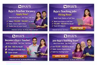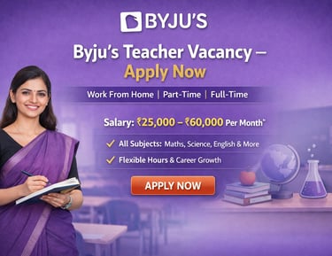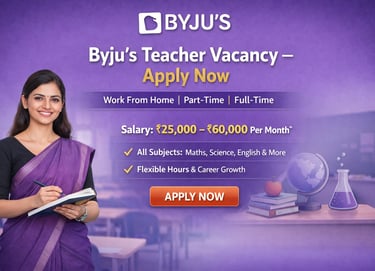 BYJU'S experienced aur passionate teachers ke liye Work From Home (WFH) Online Teaching Jobs offer karta hai. Agar aap Maths, Science ya English padhate hain (Class 1-12), to yeh ek excellent opportunity hai jahan aap ghar baithe students ko quality education de sakte hain aur stable, long-term income earn kar sakte hain.